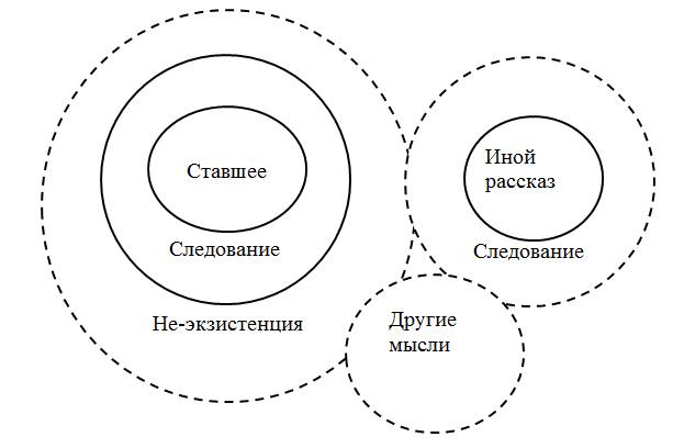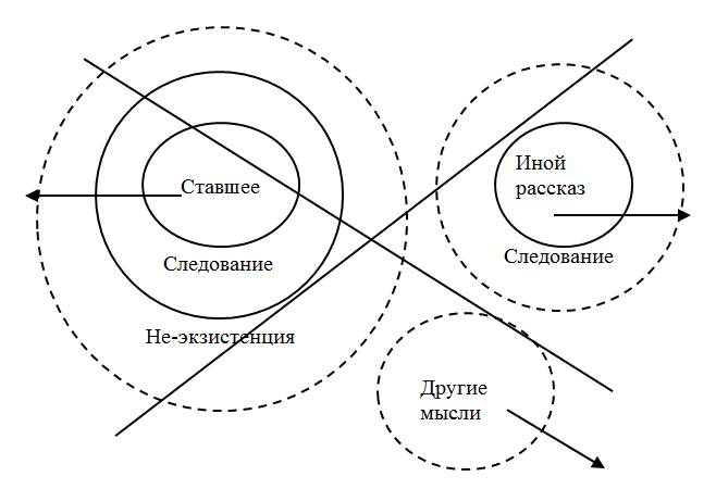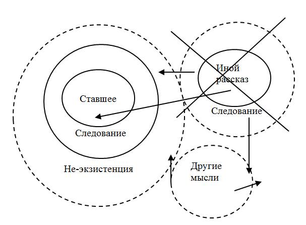 Перестать рассказывать (Схема 11). Подобное подразумевает автономию, сущее и т. д. Исход такого может быть каким угодно. Например, мысли, живя сами в себе, просто со временем будут пересказаны, и на их «обломках» возникнут новые другие рассказы и новые мысли.