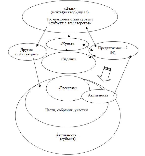 Результат (итог) любой активной субъективизации – это определенная мысль. Основная «производственная» деятельность интеллекта – это пере-рассказывание «рассказов». Но что может предложить активности такой интеллект? Техническую цель (стержень) и логику участия в непростой игре. Предложим схематически следующую типологию161 представленного (Схема 15).