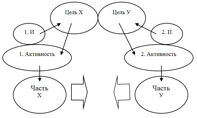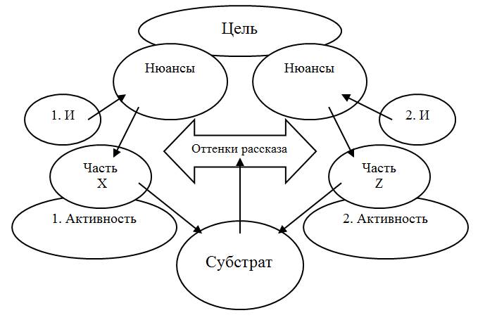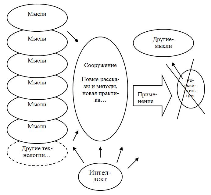 Отметим, что в схеме упущен такой инструмент, как «рассказ», в формате которого идет постоянное открытое обсуждение цели, но его в данном случае можно включать в периферию взаимоотношений интеллект – мысль – часть.