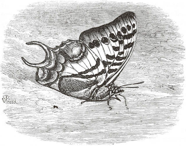 Zwanzig Meilen jenseits Buitenzorg führt die Poststraße über den Megamendong-Berg in einer Höhe von 4500 Fuß. Die Gegend ist schön bergig, und auf den Hügeln ist viel Urwald stehen geblieben sowie einige der ältesten Kaffeeanpflanzungen auf Java, wo die Pflanzen fast die Dimensionen von Waldbäumen angenommen haben. Ungefähr fünfhundert Fuß unter der höchsten Erhebung des Passes steht die Hütte eines Wegaufsehers, die ich zur Hälfte für vierzehn Tage mietete, da das Land mir für Sammlungen sehr versprechend schien. Ich fand sofort, dass die Produkte West-Javas auffallend von denen des östlichen Teils der Insel differieren und dass alle bemerkenswerteren und charakteristischen javanischen Vögel und Insekten hier vorkommen. Am allerersten Tag brachten mir meine Jäger den eleganten gelben und grünen Trogon (Harpactes reinwardti), den schimmernden kleinen Zwergfliegenfänger (Pericrocotus miniatus), der wie eine Feuerflamme aussieht, wenn er zwischen den Büschen herumfliegt, und den seltenen und merkwürdigen schwarzen und karmesinroten Pirol (Analcipus sanguinolentus), lauter Arten, die nur auf Java gefunden werden und sogar nur auf seinen westlichen Teil begrenzt zu sein scheinen. In einer Woche erhielt ich nicht weniger als vierundzwanzig Vogelarten, welche ich nicht im Osten der Insel gefunden hatte, und in vierzehn Tagen wuchs diese Zahl zu vierzig Arten an, die fast alle der javanischen Fauna eigentümlich sind. Große und schöne Schmetterlinge sind ebenfalls ziemlich häufig. In dunklen Hohlwegen und gelegentlich auch an der Landstraße fing ich den prächtigen Papilio arjuna, dessen Schwingen mit goldgrünen, in Bändern und mondförmig angeordneten Körnern bestreut zu sein scheinen, während man den elegant gestalteten Papilio coön manchmal niedrig über die schattigen Wege flattern sah (siehe die Figur S. 167). Eines Tages brachte mir ein Knabe zwischen seinen Fingern einen vollkommen unversehrten Schmetterling. Er hatte das Insekt gefangen, als es, die Flügel gerade in die Höhe gerichtet, an der Landstraße saß und aus einem Tümpel Flüssigkeit aufsog. Viele der schönsten tropischen Schmetterlinge haben diese Gewohnheit und sind gewöhnlich so emsig bei ihrer Mahlzeit, dass man sich ihnen leicht nähern und sie fangen kann. Es war der seltene und merkwürdige Charaxes kadenii, bemerkenswert wegen zweier wie ein Paar Tasterzirkel gebogener Fortsätze an jeder Hinterschwinge. Es war das einzige Exemplar, das mir je zu Gesicht gekommen, und es ist heute noch der einzige Repräsentant dieser Art in englischen Sammlungen.