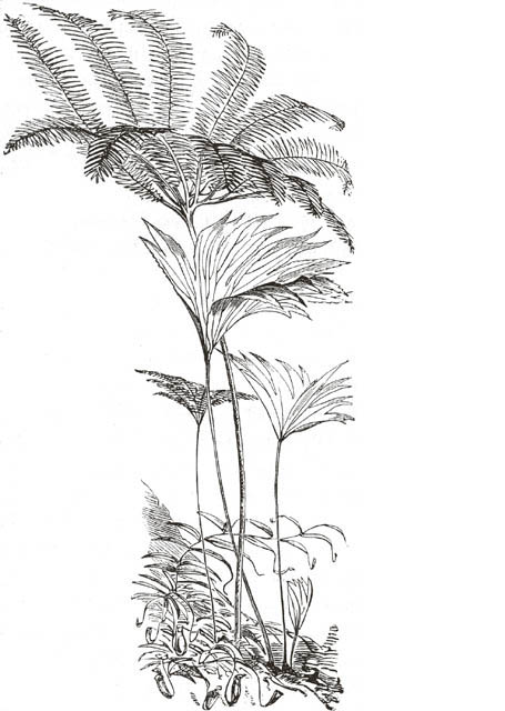 Früh am Morgen nach dem Frühstück machten wir uns auf, versehen mit wollenen Decken und Provision, da wir auf dem Berg zu schlafen beabsichtigten. Nach einem Marsch durch einen kleinen verwilderten Dschungel und ein morastiges Dickicht, durch das unsere Leute einen Weg gebahnt hatten, kamen wir in einen schönen, luftigen Wald, rein von Unterholz, in dem wir frei gehen konnten. Wir stiegen mehrere Meilen rüstig eine mäßige Abdachung hinan, zur Linken einen tiefen Bergstrom. Dann hatten wir ein ebenes Plateau zu passieren, worauf der Berg steiler und der Wald dichter wurde, bis wir an dem »Padang Batu« oder Steinfeld herauskamen, ein Ort, von dem wir viel gehört, aber den uns niemand verständlich hatte beschreiben können. Wir fanden einen steilen Abhang von platten Felsen, der sich längs des Berges weiter, als wir sehen konnten, hinstreckte. Teilweise war derselbe ganz kahl, aber wo er geborsten und zerspalten war, gedieh ein üppiger Pflanzenwuchs, in welchem die Kannenpflanzen am auffallendsten waren. Diese wunderbaren Pflanzen scheinen nie gut in unseren Gewächshäusern zu gedeihen und kommen darin nicht weit fort. Hier wuchsen sie auf zu halben Kletterstauden, ihre merkwürdigen Krüge von verschiedener Größe und Form hingen im Überfluss von ihren Blättern herab und erregten beständig unsere Bewunderung wegen ihres Umfangs und ihrer Schönheit. Hier erschienen zuerst einige Koniferen der Gattung Dacrydium, und in dem Dickicht gerade über der felsigen Oberfläche gingen wir durch Haine jener prachtvollen Farnkräuter Dipteris horsfieldii und Matonia pectinata, die große ausgebreitete, handförmige Wedel an schlanken sechs oder acht Fuß hohen Stämmen tragen. Die Matonia ist die größte und eleganteste, man kennt sie nur auf diesem Berg, und keine derselben ist bis jetzt in unsere Gewächshäuser eingeführt.