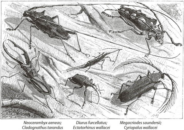 Bei meiner Ankunft an den Minen am 14. März hatte ich in den vier vergangenen Monaten 320 verschiedene Arten von Käfern gesammelt. In weniger als vierzehn Tagen war diese Zahl verdoppelt, durchschnittlich täglich ungefähr vierundzwanzig neue Arten. Eines Tages sammelt ich sechsundsiebzig neue Arten, darunter vierunddreißig mir neue. Ende April hatte ich mehr als tausend Arten, von da an vermehrte sich ihre Zahl nicht mehr in so großem Maßstab; so erhielt ich im Ganzen in Borneo ungefähr zweitausend verschiedene Arten, von denen alle bis auf hundert an diesem Ort und auf kaum mehr als einer Quadratmeile Land gesammelt waren. Die zahlreichsten und interessantesten Gruppen von Käfern waren die Bockkäfer und die Rhynchophora, beide vorwiegend Holzfresser. Erstere, charakteristisch durch ihre zierlichen Formen und langen Fühlhörner, waren besonders zahlreich, fast an dreihundert Arten, von denen neun Zehntel ganz neue und viele bemerkenswert wegen ihrer Größe, ihrer sonderbaren Formen und ihrer schönen Färbung. Letztere entsprechen unseren Kornwürmern und verwandten Gruppen und sind in den Tropen außerordentlich zahlreich und verschiedenartig, oft in Schwärmen auf totem Bauholz, sodass ich zuweilen fünfzig bis sechzig verschiedene Arten an einem Tag erhielt. Meine Sammlungen dieser Gruppe auf Borneo überstiegen fünfhundert Arten.