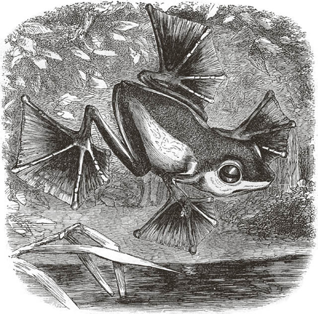 Eines der seltsamsten und interessantesten Reptilien, welches ich auf Borneo fand, war ein großer Laubfrosch, den mir ein chinesischer Arbeiter brachte. Er sagte mir, dass er ihn in querer Richtung einen hohen Baum gleichsam fliegend hinunterkommen gesehen hätte. Als ich ihn näher untersuchte, fand ich die Zehen sehr groß und bis zur äußersten Spitze behäutet, sodass sie ausgebreitet eine viel größere Oberfläche darboten als der Körper. Die Vorderbeine waren ebenfalls von einer Haut eingefasst, und der Körper konnte sich beträchtlich aufblähen. Der Rücken und die Glieder waren von einer scheinenden tiefgrünen Farbe, die Unterseite und das Innere der Zehen gelb, und die Schwimmhäute schwarz und gelb gestreift. Der Körper war ungefähr vier Zoll lang, während die vollständig ausgebreiteten Schwimmhäute jedes Hinterfußes eine Oberfläche von vier Quadratzoll bedeckten, und die Schwimmhäute aller Füße zusammen ungefähr zwölf Quadratzoll. Da die Enden der Zehen große Haftscheiben zum Festhalten haben, welche das Tier zu einem wahren Laubfrosch stempeln, so ist es nicht gut denkbar, dass diese große Zehenhaut nur zum Schwimmen da ist, und die Erzählung des Chinesen, dass er vom Baum hinunterflog, gewinnt an Glaubwürdigkeit. Dies ist, soviel ich weiß, das erste bekannte Beispiel eines »fliegenden Frosches«, und es ist für Darwinianer sehr interessant, da es zeigt, dass die Variabilität der Zehen, welche schon zum Schwimmen und Klettern modifiziert worden waren, vorteilhaft dazu benutzt wurde, um eine verwandte Art zu befähigen, gleich einer fliegenden Eidechse durch die Luft zu streichen. Es könnte eine neue Art der Gattung Rhacophorus sein, die aus mehreren Fröschen viel kleineren Umfangs besteht, deren Schwimmhäute weniger entwickelt sind.