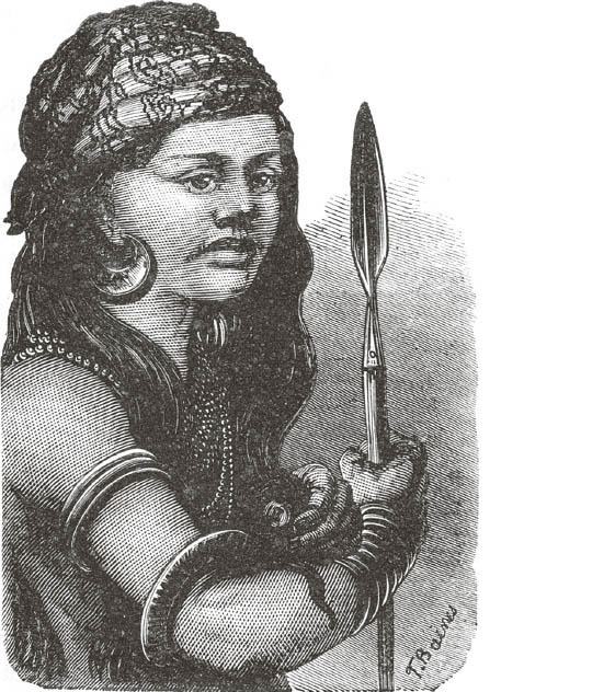Früh am Nachmittag erreichten wir das Dorf Borotoi, und obgleich es ein Leichtes gewesen wäre, bis in das nächste noch vor der Nacht zu kommen, so war ich doch genötigt zu bleiben, da meine Leute zurückkehren wollten und andere unmöglich ohne vorhergehende Verabredung zu haben waren. Außerdem war ein weißer Mann für sie eine zu große Seltenheit, als dass man ihn sich hätte entgehen lassen sollen, und ihre Frauen würden es ihnen nie vergeben haben, wenn sie von ihren Feldern zurückkehrend eine solche Merkwürdigkeit nicht für sie zur Ansicht aufbewahrt gefunden hätten. Als ich in das Haus trat, in das man mich geladen, umstand mich eine Menge von sechzig oder siebzig Männern, Weibern und Kindern, und die erste halbe Stunde saß ich da wie ein seltsames Tier, das zum ersten Mal den Blicken eines neugierigen Publikums preisgegeben wird. Metallringe waren hier im größten Überfluss und viele der Frauen hatten ihre Arme sowohl vollständig damit bedeckt, als auch ihre Beine vom Knöchel bis zum Knie. Um den Leib trugen sie ein Dutzend oder mehr Bänder von schöner roter Farbe aus Rohr geflochten, an welchen der Unterrock befestigt ist. Darunter sind gewöhnlich einige Metalldrahtbänder, ein Gürtel von kleinen Silbermünzen und manchmal ein breites Gehänge einer Metallringrüstung. Auf dem Kopf tragen sie einen konischen Hut ohne Boden, von verschiedenfarbigen Perlen gemacht und durch Rotang-Ringe in Façon gehalten, eine phantastische aber nicht unmalerische Kopfbedeckung.