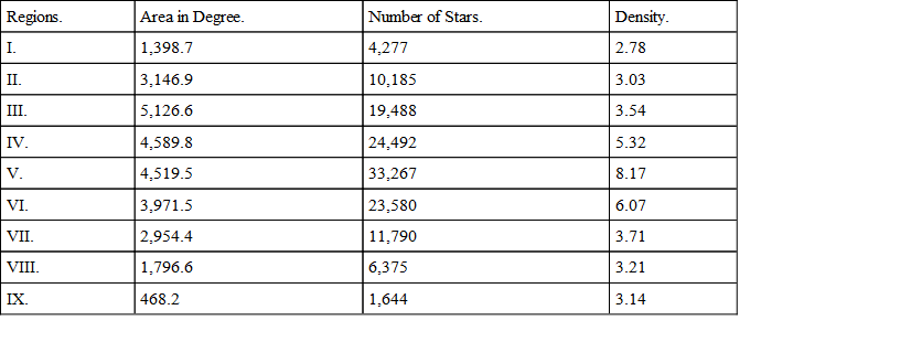 Later on Professor Seeliger of Munich made an investigation of the relation of more than 135,000 stars down to the ninth magnitude to the Milky Way, by dividing the whole of the heavens into nine regions, one and nine being circles of 20° wide (equal to 40° diameter) at the two poles of the Galaxy; the middle region, five, is a zone 20° wide including the Milky Way itself, and the other six intermediate zones are each 20° wide. The following table shows the results as given by Professor Newcomb, who has made some alterations in the last column of 'Density of Stars' in order to correct differences in the estimate of magnitudes by the different authorities.