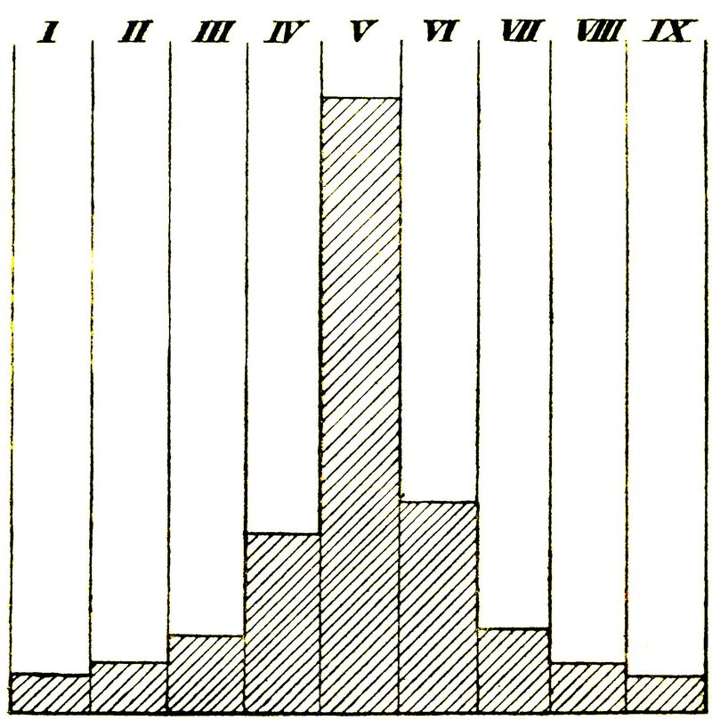 But looking at the series of figures in the table, and again as quoted by Professor Newcomb, they seem to me to show in some measure what he says they do not show. I therefore drew out the above diagram from the figures in the table, and it certainly shows that the density in regions I., II., and III., and in regions VII., VIII., and IX., may be said to be 'about the same,' that is, they increase very slowly, and that they do 'suddenly increase' in IV. and VI. as the boundary of the Galaxy is approached. This may be explained either by a flattening towards the poles of the Galaxy, or by the thinning out of stars in that direction.