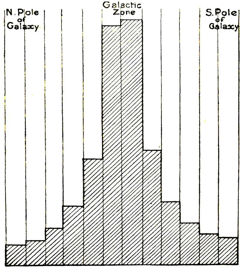 It need only be noted here that this diagram shows the same general features as those already given, of a continuous increase of star-density from the poles of the Galaxy, but more rapidly as the Galaxy itself is more nearly approached. This fact must, therefore, be accepted as indisputable.