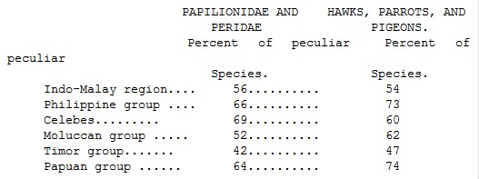 The anomalies and eccentricities in the natural history of Celebes which I have endeavoured to sketch in this CHAPTER, all point to an origin in a remote antiquity. The history of extinct animals teaches us that their distribution in time and in space are strikingly similar. The rule is, that just as the productions of adjacent areas usually resemble each other closely, so do the productions of successive periods in the same area; and as the productions of remote areas generally differ widely, so do the productions of the same area at remote epochs. We are therefore led irresistibly to the conclusion, that change of species, still more of generic and of family form, is a matter of time. But time may have led to a change of species in one country, while in another the forms have been more permanent, or the change may have gone on at an equal rate but in a different manner in both. In either case, the amount of individuality in the productions of a district will be to some extent a measure of the time that a district has been isolated from those that surround it. Judged by this standard, Celebes must be one of the oldest parts of the Archipelago. It probably dates from a period not only anterior to that when Borneo, Java, and Sumatra were separated from the continent, but from that still more remote epoch when the land that now constitutes these islands had not risen above the ocean.