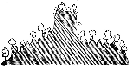 The accompanying sketch gives a section of this mountain, as near as I can make it out. The extraordinary jaggedness of the rocks is not at all exaggerated, and is the more surprising when you get into it, because from a distance it appears one smooth forest-covered hill, of very inconsiderable height, and of a gradual slope. Besides the great caverns and ridges shown above, the surfaces of each precipice are serrated in a most extraordinary manner, forming deep sloping gutters, cut out of the smooth face of the rock, or sometimes vertical channels, with angular edges, such as might be supposed to be formed were the granite in a plastic state forced up against hard angular masses.