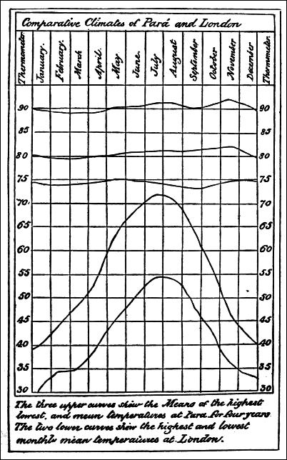 The extreme variation of the barometer at Pará for three years was only three-tenths of an inch (see diagram, Plate V.). The mean height, with all the necessary corrections, would seem to be almost exactly thirty inches; I have, however, already given my reasons for believing that there is a considerable difference in the pressure of the atmosphere in the interior of the country. In the month of May some very cold days are said to occur annually on the Upper Amazon and Rio Negro; but I never myself experienced anything of the kind worthy of notice. Many intelligent persons have assured me that the cold is sometimes so severe that the inhabitants suffer much, and, what is much more extraordinary, the fishes in the rivers die of it. Allowing this to be the fact, I am quite unable to account for it, as it is difficult to conceive that a diminution of temperature of five or ten degrees, which is as much as ever takes place, can produce any effect upon them.