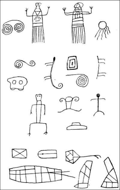 In the river Uaupés also these figures are very numerous, and of these I preserved my sketches. They contain rude representations of domestic utensils, canoes, animals, and human figures, as well as circles, squares, and other regular forms. They are all scraped on the excessively hard granitic rock. Some are entirely above and others below high-water mark, and many are quite covered with a growth of lichens, through which, however, they are still plainly visible. (Plates VIII. and IX.) Whether they had any signification to those who executed them, or were merely the first attempts of a rude art guided only by fancy, it is impossible now to say. It is, however, beyond a doubt that they are of some antiquity, and are never executed by the present race of Indians. Even among the most uncivilised tribes, where these figures are found, they have no idea whatever of their origin; and if asked, will say they do not know, or that they suppose the spirits did them. Many of the Portuguese and Brazilian traders will insist upon it that they are natural productions, or, to use their own expression, that "God made them;" and on any objection being made they triumphantly ask, "And could not God make them?" which of course settles the point. Most of them in fact are quite unable to see any difference between these figures and the natural marks and veins that frequently occur in the rocks.