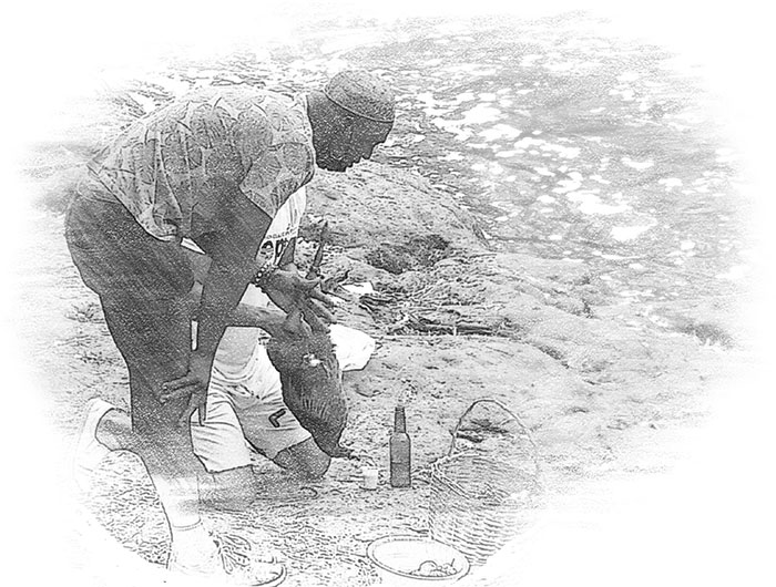 Чуть дальше в стороне берег речки был усеян перьями, кусочками еды и пустыми бутылками. Воняло там страшно! Если бы не запах жарящегося мяса, походило бы на помойку. То были остатки от жертвоприношений.