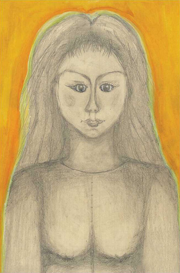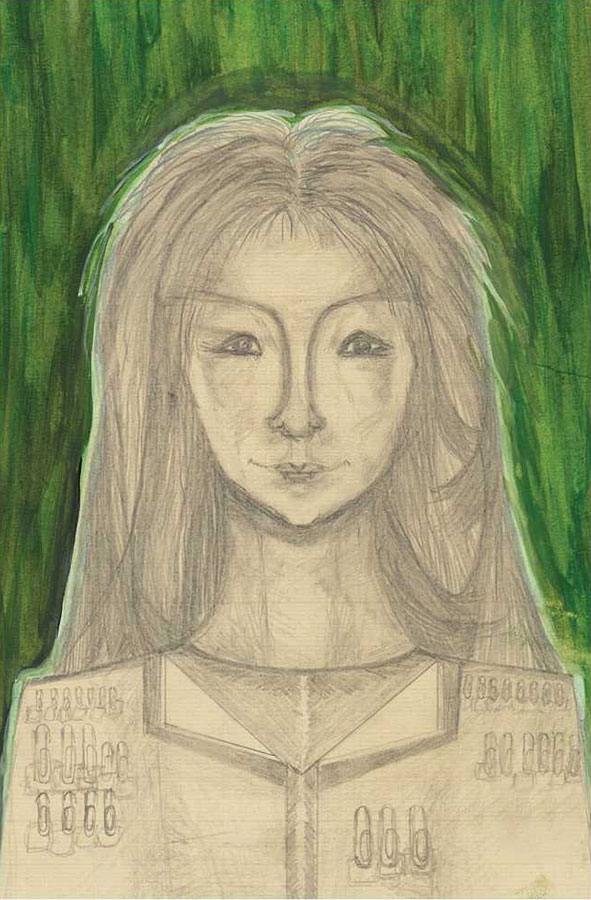 Эта масса стала приобретать какую-то форму, и вскоре стали появляться её очертания: это было существо, очень гибкое, пластичное, оно стало завязываться в узел, затем снова развязываться. Так повторялось несколько раз, и наконец, появился объект с волосами пепельного цвета, закрывающими всю спину и даже ниже её. На нём был френч, на котором были скрепки разного цвета, к скрепкам были прикреплены небольшие листочки бумаги, а может не бумаги, а иного материала, только с глянцевой поверхностью, они казались хрупкими.