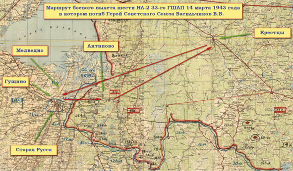 Ситуационная схема боевого вылета Ил-2 14 марта 1943 года в районе Старой Русы на карте