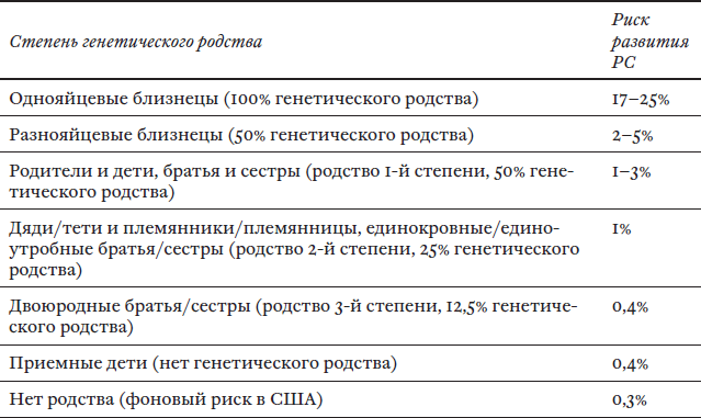 Примечание. Поскольку я пользовался разными источниками, то округлил значения до ближайшего целого или привел диапазон значений. Сравнивать разные процентные соотношения можно лишь ограниченно, так как не во всех источниках приводились данные по всем степеням родства. На данный момент мы не знаем, насколько на эту статистику влияют изменения образа жизни.