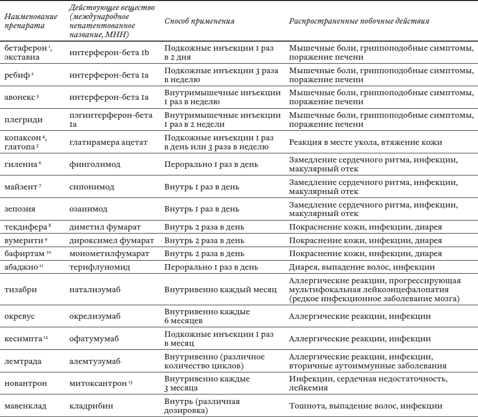 В долгосрочной перспективе для предотвращения обострений и появления новых очагов на МРТ могут применяться препараты, изменяющие течение рассеянного склероза (далее ПИТРС). Они призваны предотвращать обострения, но не всегда уменьшают выраженность симптомов РС, подобно тому как аспирин снижает риск повторного сердечного приступа, но не уменьшает ущерб, нанесенный первым приступом. ПИТРС, одобренные регуляторными органами Европы и США по состоянию на 2020 год, приведены в таблице 1.3, а прочие препараты, применяемые при РС, – в таблице 1.4. Все они снижают частоту обострений и замедляют появление новых очагов на МРТ, а для некоторых препаратов также подтверждено, что они в перспективе снижают степень развития нетрудоспособности и атрофии головного мозга.