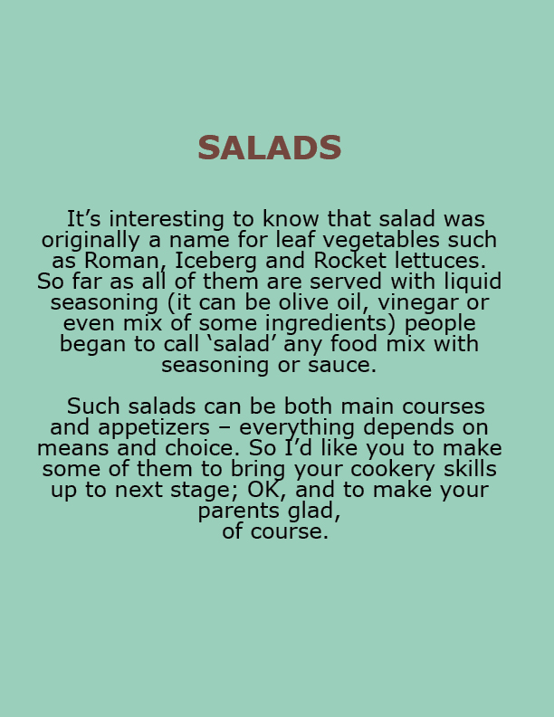 Thus you have a brilliant chance to begin you culinary education, and I promise to help you with it. You will know how to make some dishes, to prepare basic foodstuff and then to surprise your mom and dad.