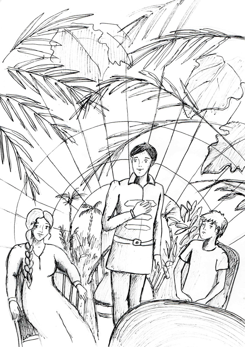 Эмма и Арей вошли внутрь и оказались в оранжерее, укрытой огромным стеклянным куполом. Они направились вперёд по дорожке, мимо финиковых пальм, различных деревьев и цветущих кустов. Дорожка, извиваясь, уходила в густые заросли сада, и Эмме иногда приходилось нагибаться под длинными ветвями и широкими листьями.