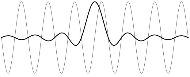 А вот результат (рис. 2.13) сложения двух «разбросанных» сокселей. В каждой горизонтальной позиции возьмите высоты расположенных там сокселей (светло-серые), измеренные от линии нулевой громкости, и сложите их вместе, чтобы получить точку на жирной кривой.