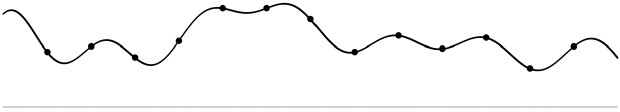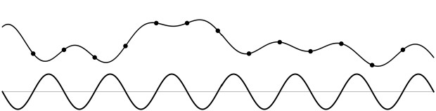 Перейдем к сути замечательной идеи Котельникова: если вы делаете отсчеты некоей гладкой аналоговой кривой с удвоенной частотой самой высокой частоты волн Фурье из составляющей ее суммы, то вы всегда сможете точно восстановить обратно эту гладкую кривую, используя только сделанную выборку. Отсчеты дискретные, разрозненные, отделенные друг от друга – определенно не гладкие. Это первая часть его идеи, великая теорема отсчетов – та часть, в которой утверждается, что аналоговую гладкость можно заменить цифровой несвязностью. Во второй части рассказывается, как выполнить фактическое восстановление исходного аналогового сигнала из цифровых отсчетов.