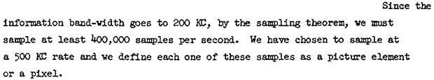 Самому слову «пиксель» пришлось побороться за право на существование. Пиксели поначалу назывались по-разному: например, точки, массивы точек, растровые элементы, точки изображения и элементы изображения. Последний вариант победил, но затем разгорелась битва за более короткий термин. В течение многих лет IBM и AT&T пытались сокращать «элемент изображения» (picture element) до pel. Но энергичное молодое сообщество середины 1960-х, занимавшееся обработкой изображений, одержало победу над усилиями гигантских корпораций, настояв на сокращении pixel. На самом деле для молодых гиков, работающих с компьютерной графикой, вроде меня, достигших совершеннолетия в те бурные годы, было делом чести обеспечить победу контркультуры «пикселя», свергнув «пел» Голубого Гиганта и Матушки Белл. Ричард Лайон, тщательно изучив историю словоупотребления, нашел самое раннее упоминание термина[2] pixel в документе 1965 года за авторством Фреда Биллингсли из Лаборатории обработки изображений, входившей в Лабораторию реактивного движения Калифорнийского технологического института (рис. 2.8). А самое раннее публичное использование pel зарегистрировано в статье профессора Массачусетского технологического института Уильяма Шрайбера в 1967 году.