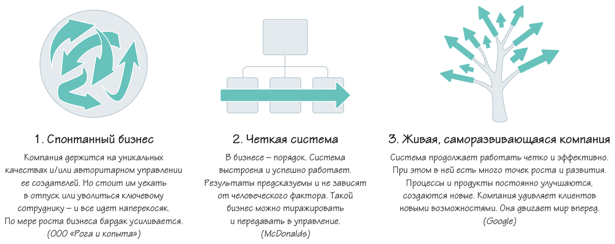 А почему нельзя прийти сразу к живой, саморазвивающейся компании? Потому что развитие бизнеса – это путь повышения зрелости: системы управления, команды и вас лично. Путь организационный и духовный. Он требует времени и сил. Невозможно из ребенка сразу стать взрослым. К сожалению, монтаж бывает только в кино.