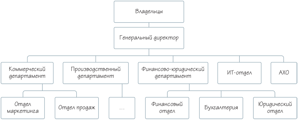 Организационная структура компании[37] – иерархическая схема подчиненности, включает в себя подразделения и должности. По уму ее нужно создавать на основе бизнес-процессов: чтобы она помогала им выполняться эффективно.