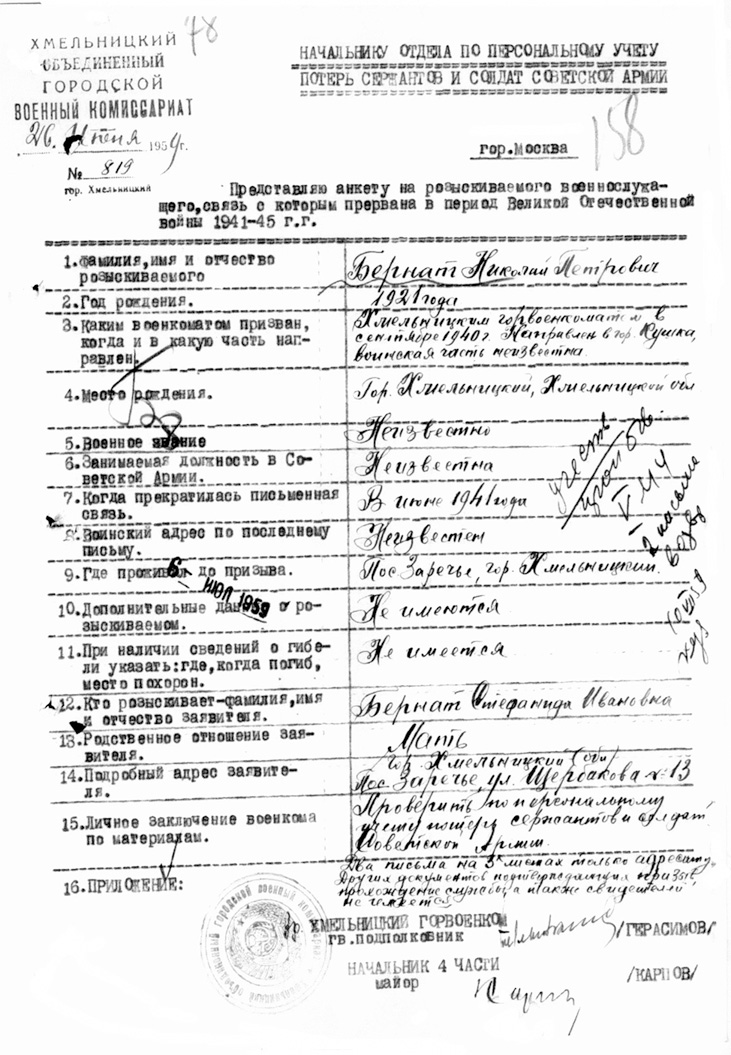 Анкета, которая была заполнена матерью Н. П. Берната в 1959 г.