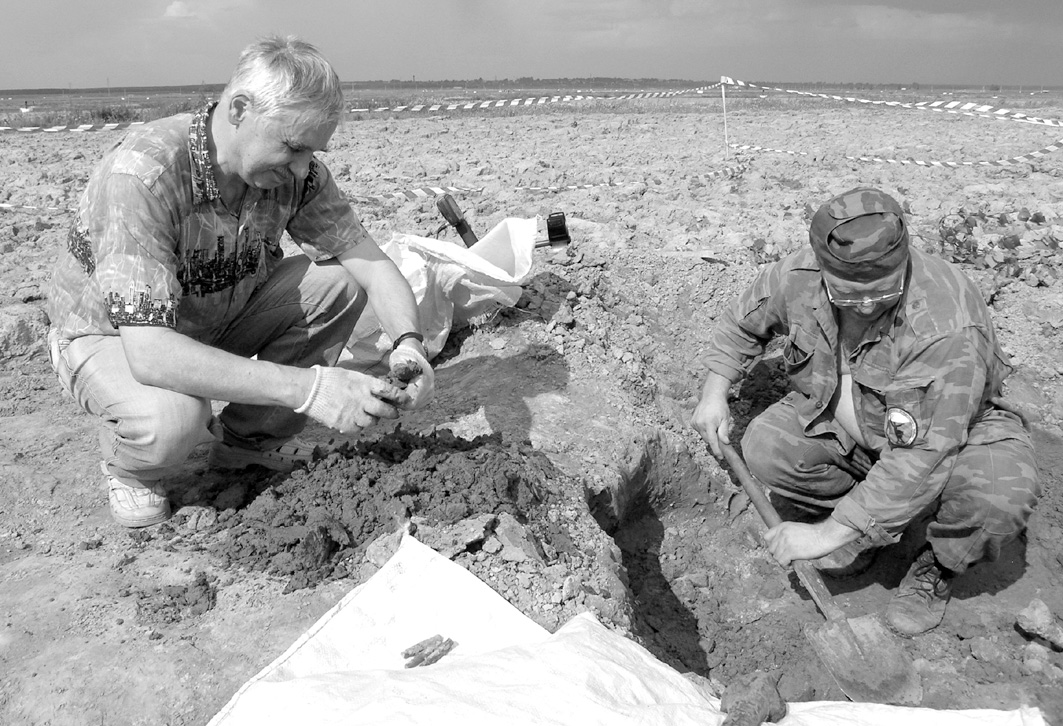 Группа начала осматривать указанный участок местности и довольно скоро вблизи лесной опушки нашла поляну, на которой явственно выделялся участок с заметно просевшей почвой. Ее форма и проверка щупами показали, что это, возможно, и есть забытое захоронение. Раскопки быстро это подтвердили. Были найдены останки 36 погибших. Судя по амуниции, все они были кавалеристами. Их имен мы не знаем. Единственный найденный под Петровкой медальон оказался пустым. Основываясь на списках боевых потерь, можно сделать только некоторые предположения. В районе Доршева 58-я танковая дивизия потеряла два танка БТ-7. Именно в одном из них мог погибнуть экипаж или его часть. Среди потерь 58-й числится механик-водитель Никишин Михаил Петрович. Правда, местом его гибели указано с. Покровка, а дата смерти – 27.11.1941 г. Но поскольку в этот день 58-я танковая дивизия находилась уже под Дмитровом, где нет населенных пунктов с похожим названием, можно предположить, что дата неправильная, а место гибели все-таки д. Петровка. Искажение ее наименования получилось в результате «скрещивания» названий Петровка и Покровское, которое находится неподалеку.