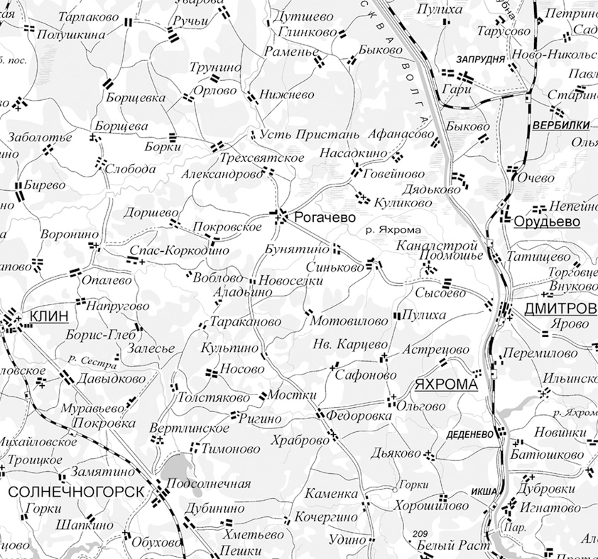 Пойма Яхромы в этом районе представляет собой главный ландшафтообразующий фактор. Вдоль нее, по южной границе расположены села Синьково и Подмошье, а также деревни Зверково, Бунятино, Абрамцево, Подвязново. Через них и проходит дорога Дмитров – Рогачево – Клин. По северной границе поймы стоят деревни Орево, Петраково, Клюшниково и Давыдково, село Куликово, поселок возле Пешношского монастыря, называвшийся в 40-х годах. Прожектором, а ныне Луговым (в дальнейшем мы будем употреблять старое название). Эти населенные пункты также связаны дорогой, ведущей через деревню Василево к Рогачеву. Перед войной, особенно до постройки канала, важным был путь от монастыря через село Говейново и деревни Насадкино и Паньково туда, где ныне располагается платформа Соревнование. Непосредственно у реки или вблизи ее нижнего течения находятся деревни Копытово, Александрово, Ольсово и Усть-Пристань. С юга к Рогачеву идет шоссе от Москвы, а на севере проложена дорога на Усть-Пристань. Все эти шоссе и проселочные дороги делают Рогачево важным транспортным узлом.