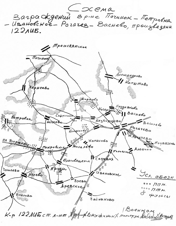 Схема инженерных заграждений в окрестностях Рогачева (ЦАМО РФ. Ф. 3557 (24-я кд), Оп. 1. Д. 7, Л. 51.).
