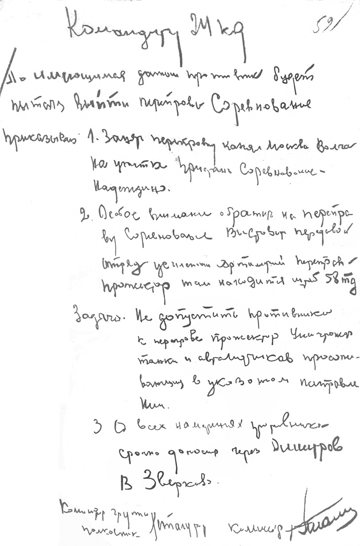 Только какая-то часть дивизии приняла участие в обороне мостов у Прожектора. Об этом можно судить по тому приказу, часть которого мы уже цитировали. Согласно ему требовалось «выставить передовой отряд, усиленный артиллерией на переправе Прожектор: там находится штаб 58 тд.