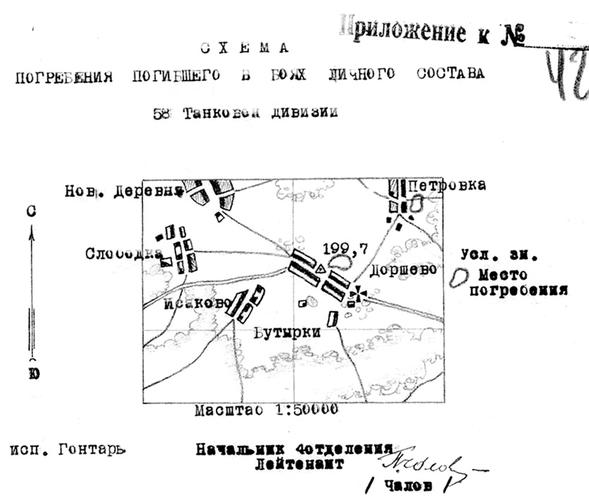 Места погребений воинов 58-й танковой дивизии в районе Доршево и Петровки.