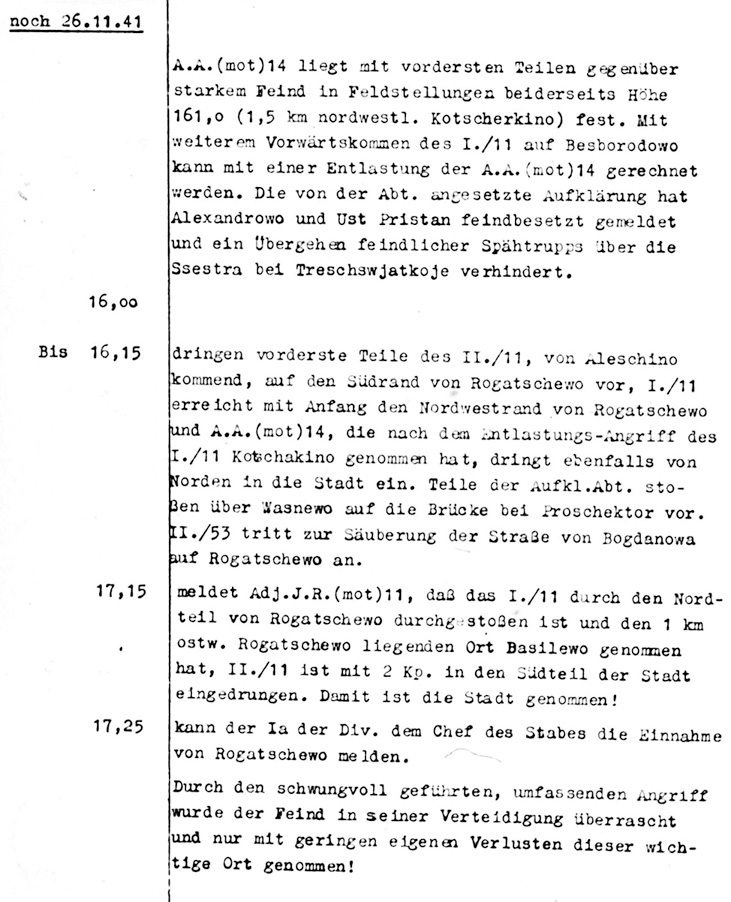 Страница журнала боевых действий немецкой 14-й мтд за 26.11.41 г. с записью о взятии Рогачева (17.15).