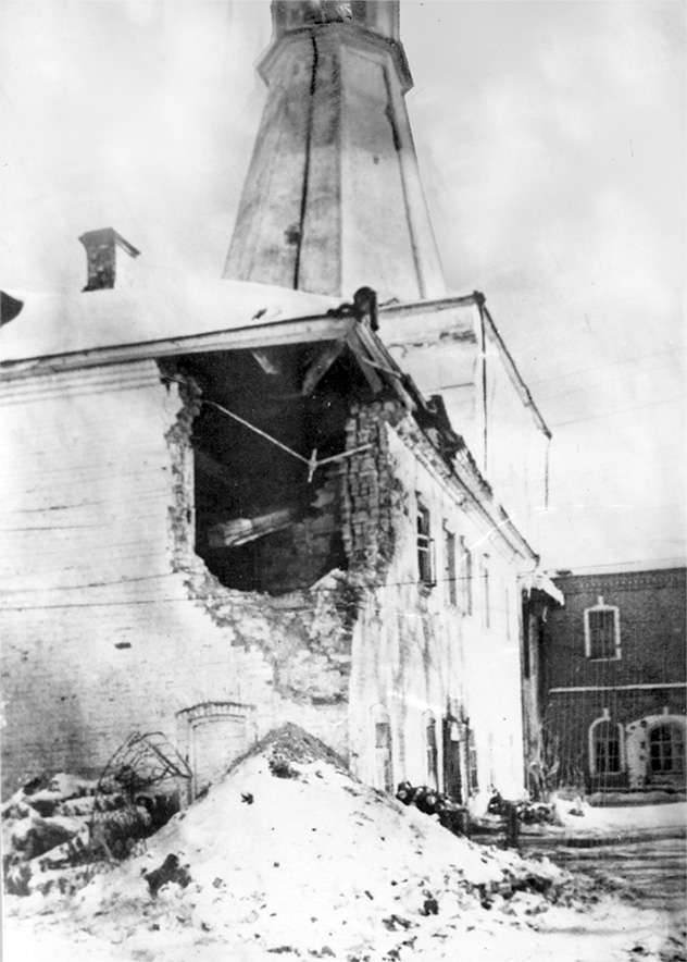 Разрушения в Николо-Пешношском монастыре от прямого попадания снаряда.