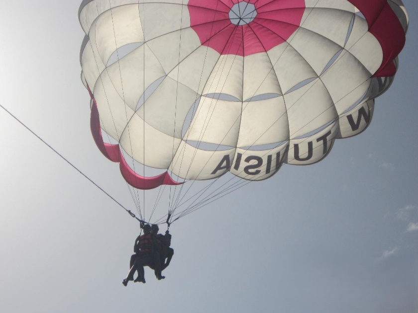 Море в Тунисе неспокойное. С моим умением плавать устраивать заплывы без вариантов. Я прыгала и качалась на волнах с удовольствием. Один мужчина наблюдавший за тем как я болтаюсь на волнах как цветок в проруби и меня периодически уносит от берега научил меня плавать вдоль волны. Днём над морем летали на парашютах. Мне тоже захотелось и я уговорила Лизу. Мы взяли с собой инструктора и полетели. Мы пролетали над морем и разглядывали кораллы с высоты. Когда пришло время посадки я боялась, что сядем мы на какую-нибудь крышу или дерево. Посадка была идеальной, приземлились мы ровно в том же месте где и взлетали. Если бы не одно НО. Я наступила на только что кем-то брошенный окурок. Было очень больно и горячо.