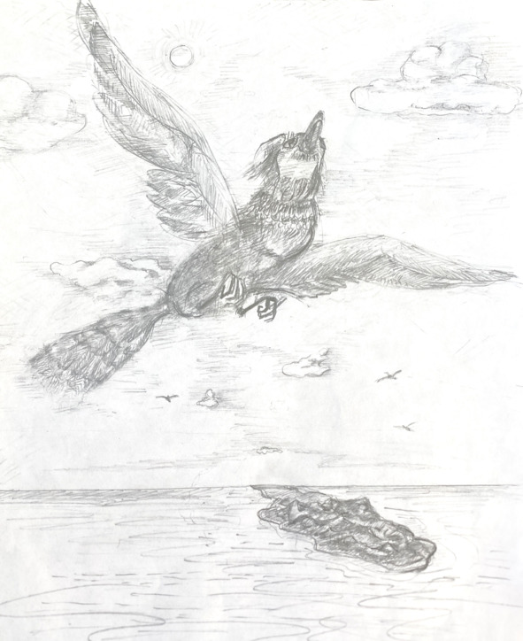 Остров вдруг ожил: рядом пролетела стая птиц, на воде появились небольшие волны, а ветер принёс звук чьих-то приближающихся шагов. Старец обернулся и увидел неизвестного молодого человека, идущего в их сторону. Выглядел незнакомец как обычный городской житель, одетый в белую футболку с логотипом, похожим на букву «А», простые синие джинсы и лёгкие кеды на босу ногу.