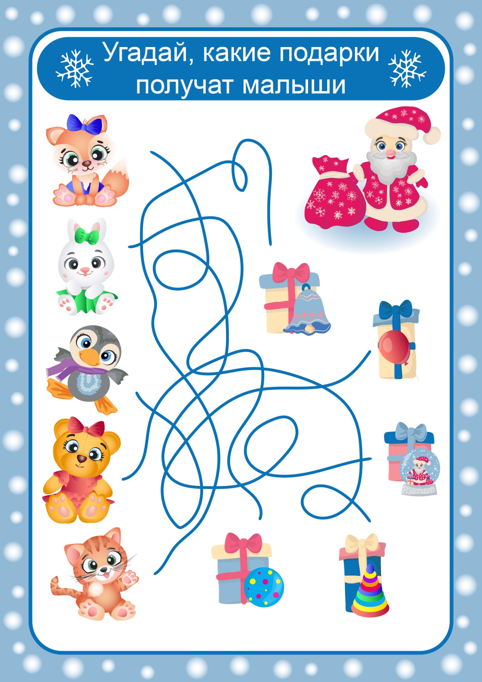 Чтобы узнать, какие подарки от Дедушки Мороза получат малыши, проведи по линиям.