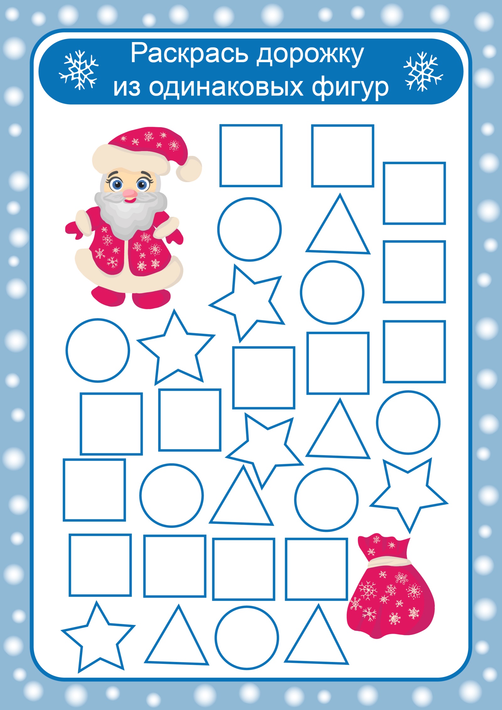 Помоги Деду Морозу добраться до своего мешка с подарками. Каких фигур больше на картинке: кругов или треугольников?