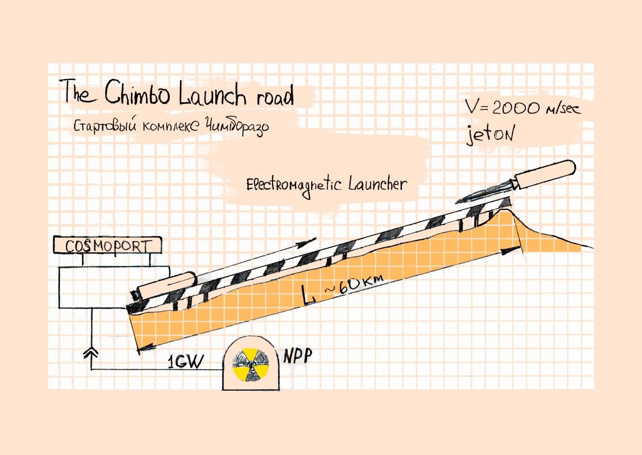 Сегодня единственным способом преодолеть гравитацию и безопорное пространство для нас является реактивная тяга. Объемы рабочего тела и скорость его истечения имеют критическое значение. В соответствии с этим ограничением, на Земле необходимо создать разгонную электромагнитную установку. Ее «электромагнитность» достаточно условна, уточненные расчеты могут показать, что оптимальным решением может стать «нулевая» ступень с кислородно-водородной энергетикой. Идеальным местом расположения Космопорта является гора Чимборазо (6268 м) в Эквадоре, это самая уделенная от центра Земли точка рельефа (на 2000 метров ближе к звездам чем Джомолунгма), расположенная в районе земного экватора. Разгонная трасса длинной около 60 километров со столом отрыва в районе вершины горы позволит комфортно разгонять массивные космические корабли до скоростей более 2000 м/с. Рельеф в районе горы Чимборазо представляется будто специально созданным для этих целей. Для энергоснабжения Космопорта необходимо построить атомную электростанцию.