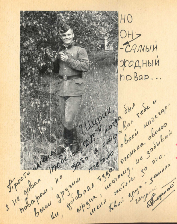 – «Шурик, мне бы твой вес – я бы такое вытворял!». В самоволки бегал, подробностей не знаю. Знаю, что девчонок любил и знал, как с ними общаться. Почему он потом в кочегарке работал – не помню, но к нему можно было всегда зайти погреться душой и телом.