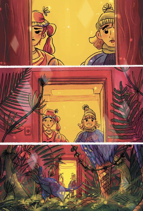 Пахнуло тропической жарой. Мы сразу вспотели в перчатках и шапках. Перед нами были джунгли, сочные и влажные. Над деревьями, ростом в три пальмы, стоял тираннозавр, испуская грозный рёв. Далеко, возле горизонта, лениво и мерно покачивались маленькие головы на длиннющих шеях – брахиозавры. Небо было красное. Редкие птеродактили прорезывали облака.