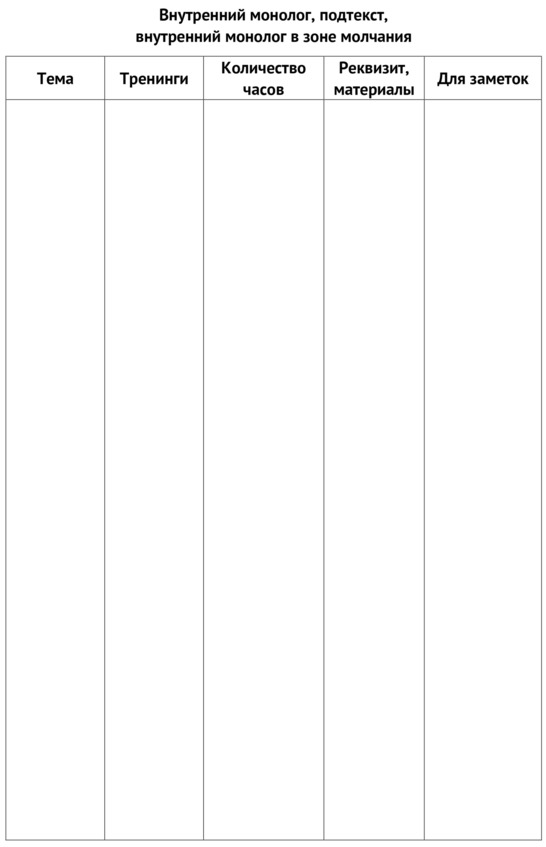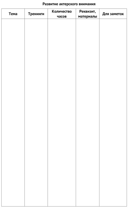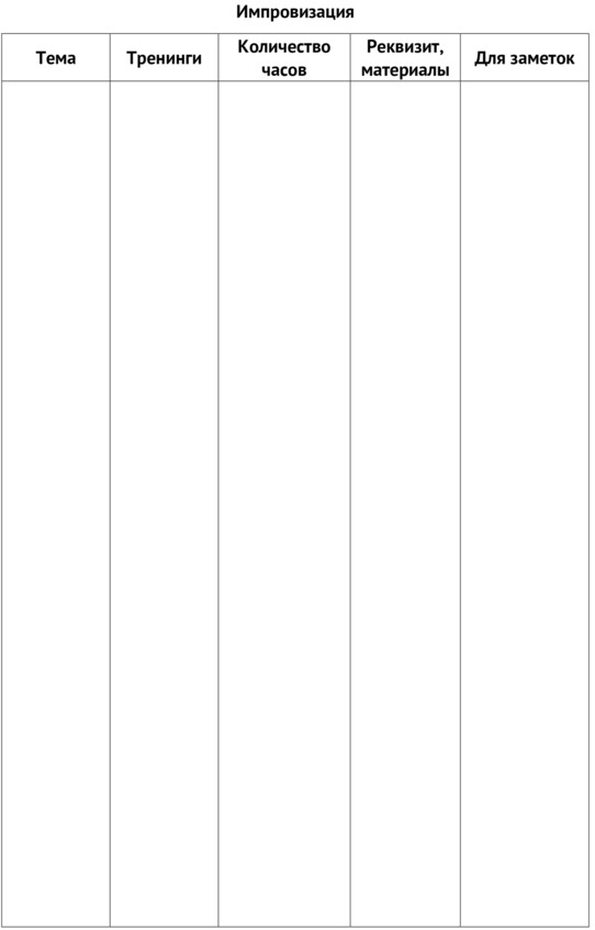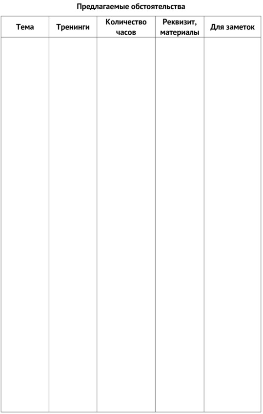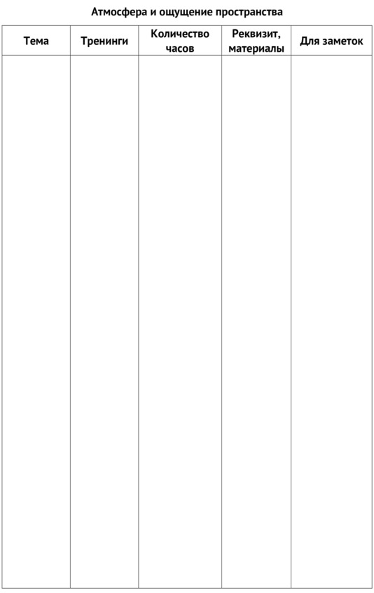 Графа «для заметок» предназначена для вашего удобства, и чтобы ничего не забыть. Вы можете помечать нюансы, которые возникли во время работы с тренингом, чтобы потом можно было внести правки или немного изменить упражнение под потребности, возможности, возраст детей, ситуацию, цели или имеющиеся ресурсы; помечать на чем сделать акцент в следующий раз, что получается или нет у детей; прописывать что нужно сделать или не забыть во время тренинга – необходимый реквизит, текст, названия эмоций, ассоциаций, предлагаемых обстоятельств, заданий; домашнее задание для учеников; рефлексию – заранее подготовленный текст для ее проведения или то, что вы должны учесть после ее проведения. Также, чтобы не потерять важное и понравившееся упражнение для занятий.