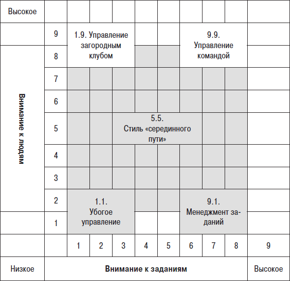 3. Управление загородным клубом – максимум внимания к подчиненным, к их интересам и способностям, правильное выполнение заданий остается вторичным делом. Для творческих коллективов такой стиль управления может быть достаточно эффективным. Здесь хочется подчеркнуть, что мы говорим о крайностях. В существующих компаниях чаще всего нет максимумов и минимумов, есть тенденции. Еще одно важное замечание – даже минимум внимания к заданиям предполагает их выполнение. В этой модели (как вы видите) нет строки – «невыполнение заданий», так же как нет строки – «полное невнимание к подчиненным». Модель управленческой сетки говорит о преобладании той или иной тенденции, а не об отсутствии ее напрочь. Если то или иное направление внимания исключено напрочь, это даже не пресловутый bad management, а отсутствие управления как такового.