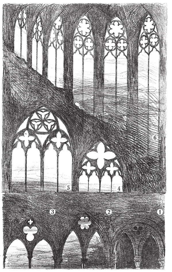 Таковы, на мой взгляд, три основных вида обмана, развращающие архитектуру; существуют, однако, и другие, менее явные, от которых можно защититься не столько с помощью определенного закона, сколько вооружившись духом мужественности и искренности. Ибо, как уже отмечалось ранее, существуют определенные способы введения в заблуждение, касающиеся только впечатлений и идей, из которых иные могут иметь действительно положительный эффект, как, например, упоминавшееся уже впечатление древовидности готического нефа, но большинство которых являются лишь надувательством и компрометируют любой стиль, в коем преобладают, а преобладать они начинают сразу, едва только допускаются, имея способность поражать воображение как недалеких архитекторов, так и невзыскательных зрителей. Точно так же неразвитые и ограниченные умы восхищаются тем, что их смогли обмануть, или тешат свое тщеславие тем, что смогли обнаружить обман. И когда при этом демонстрируется такая ловкость рук в работе с камнем или в архитектурном решении, которая сама по себе становится предметом восхищения, то может оказаться, что, идя по этому пути, мы будем все дальше отклоняться от уважительного и внимательного отношения к подлинным ценностям в искусстве и в конце концов придем к его полному бессилию и деградации. И против этого нет другого средства, кроме полного презрения ко всему показному и изощренному в искусстве и стремления вложить всю свою фантазию в правильное соотношение масс и форм, заботясь о внешнем оформлении их взаимодействия не больше, чем великий живописец заботится о том, как его кисть наносит удары по холсту. Нетрудно было бы привести множество примеров опасности вышеуказанных тщеславных ухищрений, но я ограничусь рассмотрением одного, которое, на мой взгляд, послужило причиной падения готики в Европе. Я имею в виду систему пересекающихся профилей. И, учитывая большую важность данного вопроса, да простится мне, что, боясь наскучить читателям, я ограничусь изложением его сути.