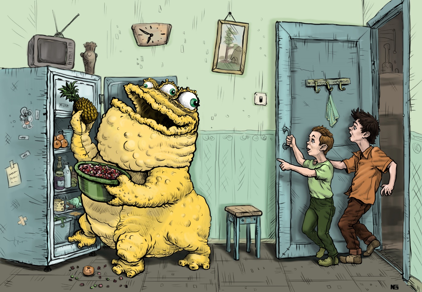 Возле открытой дверцы холодильника черпал ложкой винегрет и отправлял себе в рот толстый, желтый, трёхглазый, двурукий и четвероногий ОН.