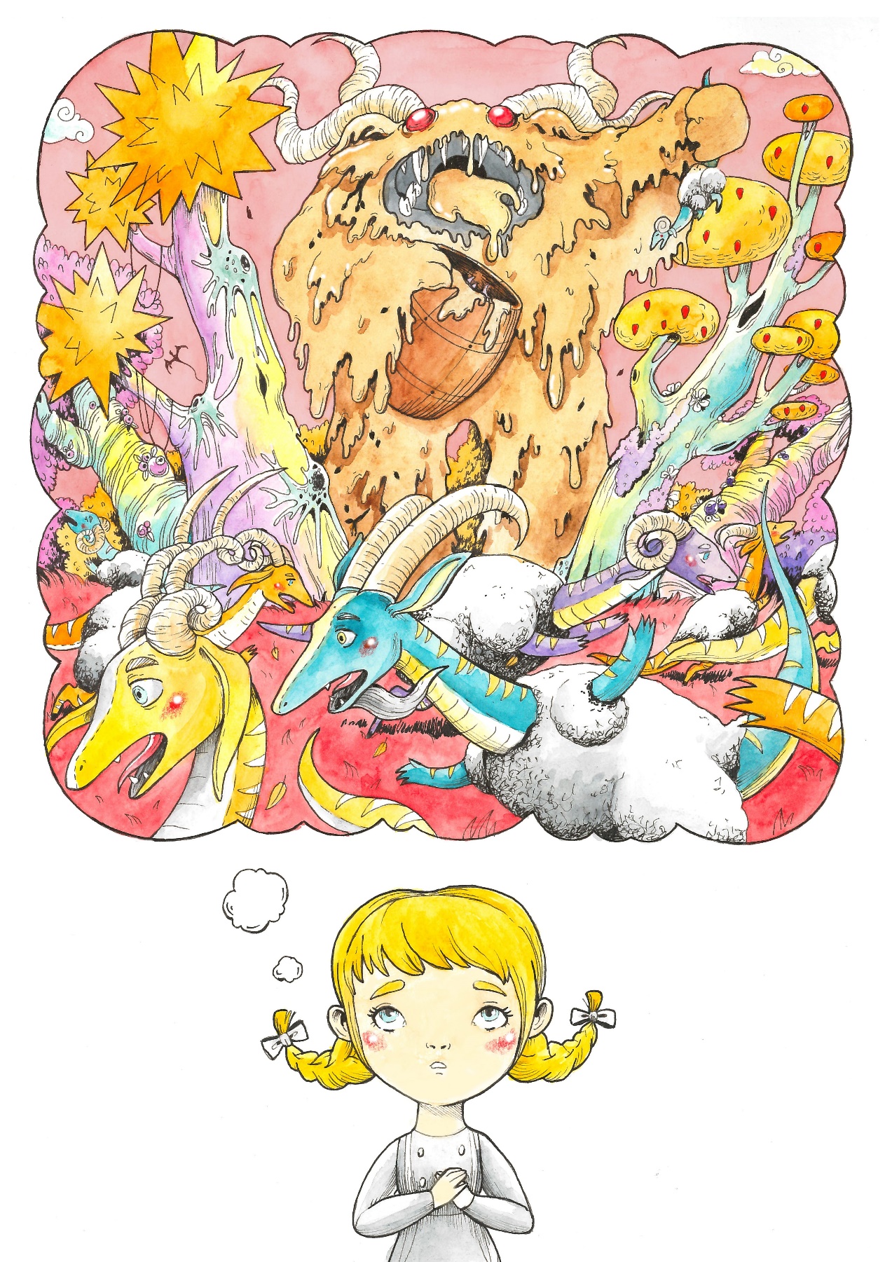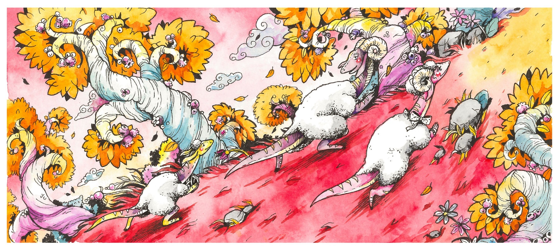 Из темноты навстречу баранозаврятам и Лисане выскочило существо, похожее на зелёного слизня в чёрную полоску и размером с большую собаку. Его выпученные лягушачьи глаза бешено вращались, а из широкой беззубой пасти свешивался жирный синий язык. Существо, хоть и было безногим, очень резво скакало, шлёпая, хрюкая, хлюпая и разбрызгивая во все стороны липкую светло-розовую жижу.