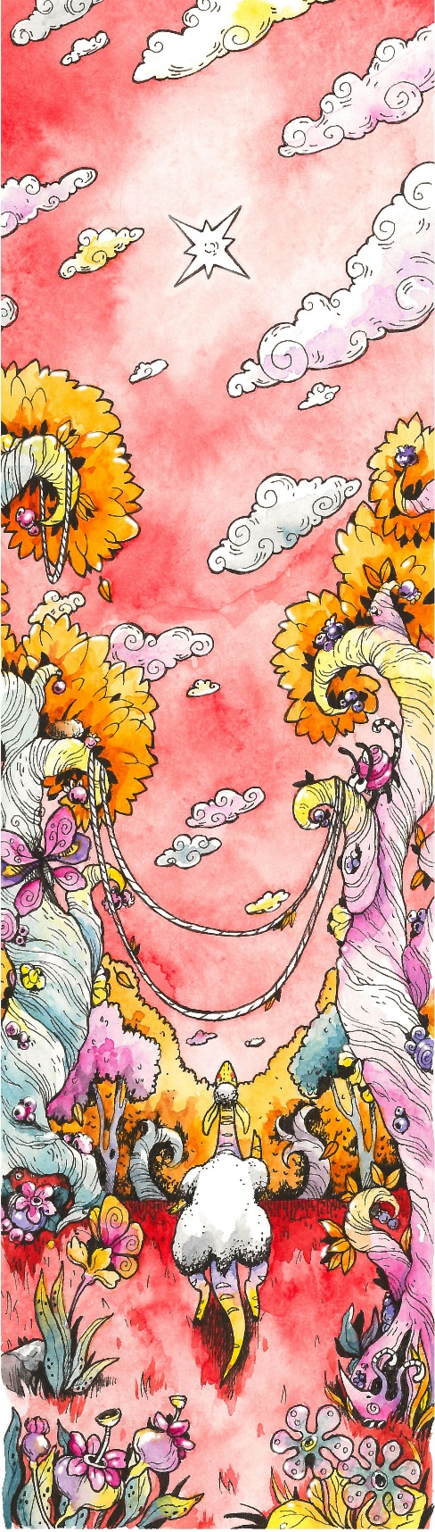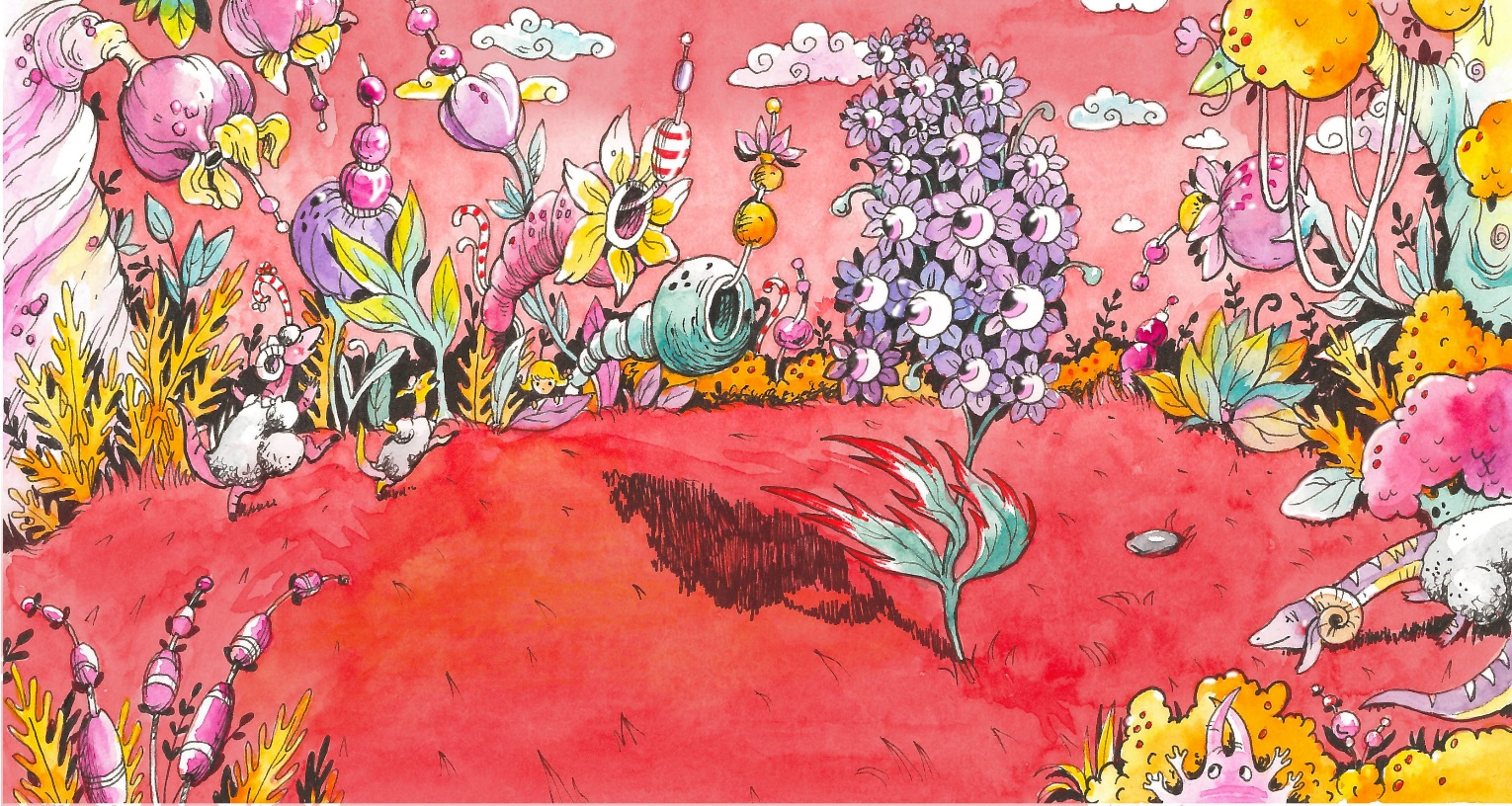Баранозаврята бесшумно ступали по сухой бордовой траве. Лисана брела сзади, стараясь не упустить друзей из виду. Не шуметь у неё не получалось. Баранозавры остановились и пригнулись. Бебеслав показал что-то жестами остальным и беззвучно исчез в кустах. Лисана на цыпочках подкралась к Бене с Бебеллой. Едва она открыла рот, как бараназавры стали на неё шикать и строить страшные гримасы, показывая, что нужно вести себя тихо-тихо. Бебелла отодвинула когтем рыжий лист мамортника. За ним открывалась полянка, посреди которой торчал одинокий высокий и тонкий стебель. На его верхушке красовались фиолетовые бутоны, а зазубренные листья оканчивались длинными багровыми шипами.