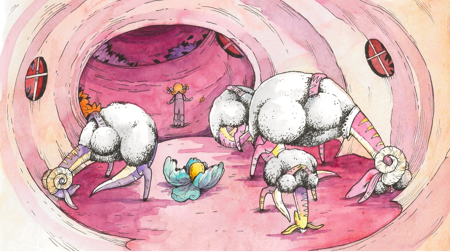 Повисла напряжённая тишина. Цветок осторожно потянулся к баранозаврам. Тут Бебеслав издал пронзительный вопль и зажал нос лапой. Цветок от неожиданности выпучил все двадцать глаз, с треском выпустив сиреневое облачко, и втянул стебель в землю. Вместо него из земли выскочил и с хлопком раскрылся огромный зелёный с голубыми прожилками кочан.