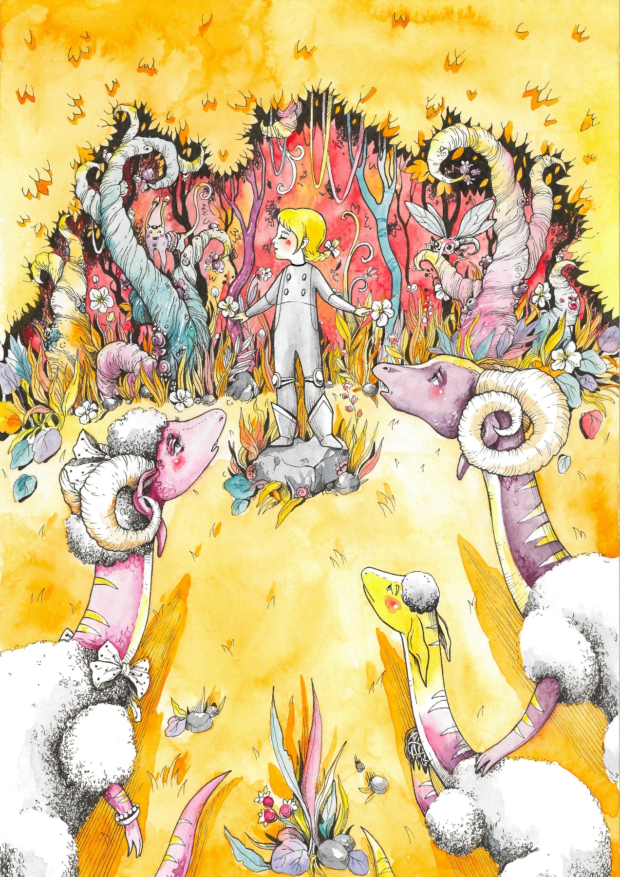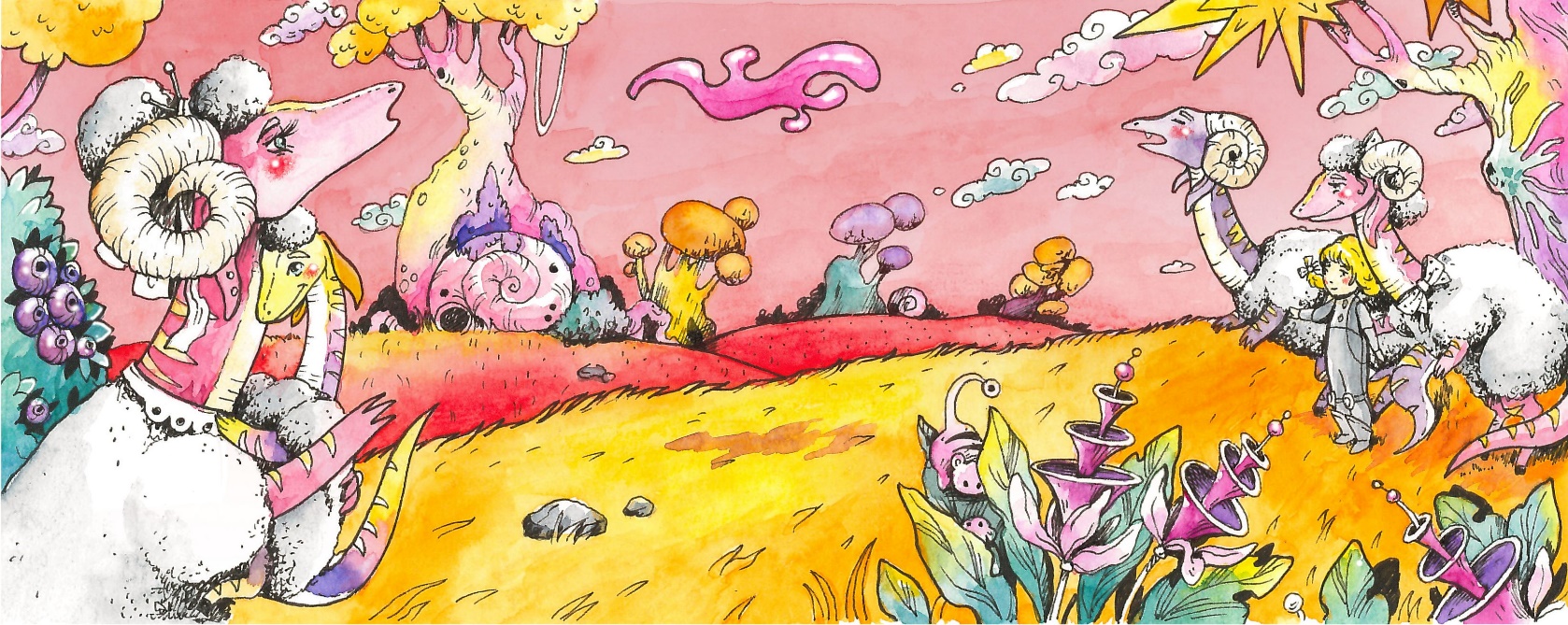 День выдался замечательный – солнце ярко светило сквозь облака на оранжевом небе. Лёгкий ветерок лениво раскачивал верхушки деревьев, срывая листья и устилая ими бордовую траву. По узкой тропинке, стуча копытами и сбивая росу мощными хвостами, неслись сквозь лес баранозаврята. Впереди бежали наперегонки старшие брат и сестра со звучными именами Бебеслав и Бебелла, за ними еле поспевал малыш Беня, сжимая в передних лапах плетёный мяч. На самом деле, его полное имя Бениамин, но все зовут его просто Беня, ведь у него ещё даже не выросли рожки.